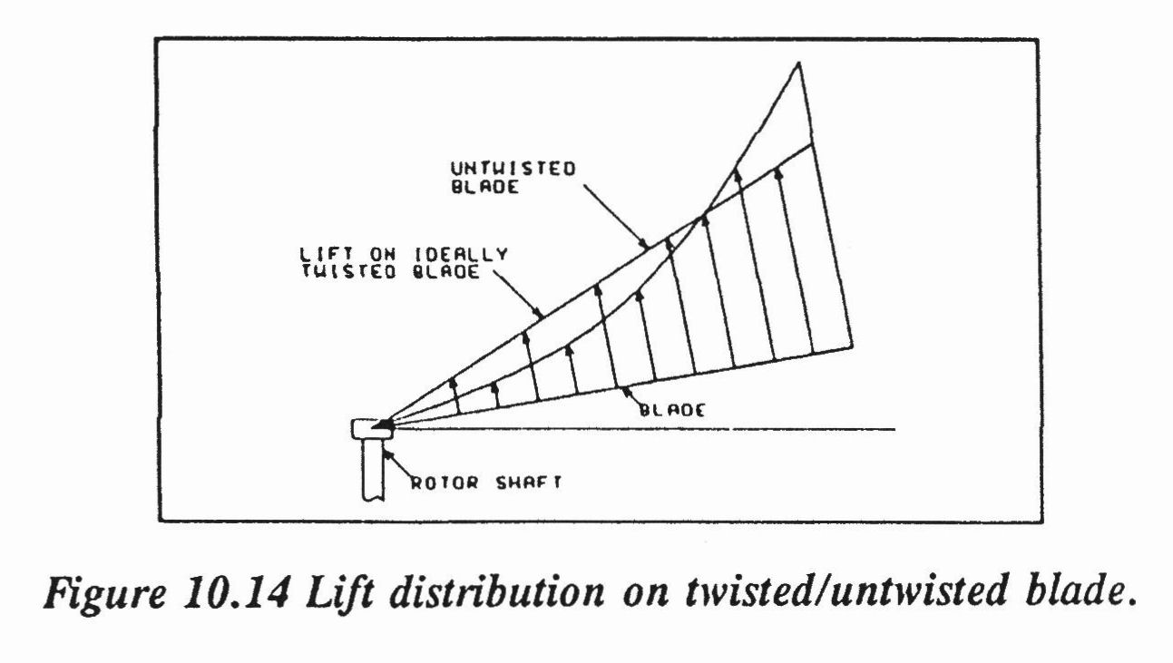 Eigenlijk is een helikopter niets anders dan een ‘vliegtuig met dak aandrijving’. Dat wil zeggen, het reageert in de voorwaartse vlucht net als een eenvoudig propellervliegtuig. De neusstand bepaalt de snelheid en het vermogen de hoogte. Maar het vliegt om heel andere redenen. Er is immers geen vaste vleugel die lift produceert. De lift waarmee het toestel zich van de aarde kan verheffen wordt geproduceerd door twee of meer ronddraaiende hoofdrotorbladen, die zich ongeveer in het zwaartepunt ‘op het dak’ bevinden. Aan de uiteinden hebben de bladen een hogere snelheid dan aan de wortel, dus om enigszins gelijkmatig lift te kunnen leveren moet de invalshoek aan het eind van het blad kleiner zijn dan aan de wortel. Daarom zit er in het blad een verdraaiing of ‘twist (zie figuur 10.14). Dit is bij modelheli’s meestal niet het geval, bij mijn voorbeeld (T-rex 500 Pro) is het in ieder geval niet zichtbaar.