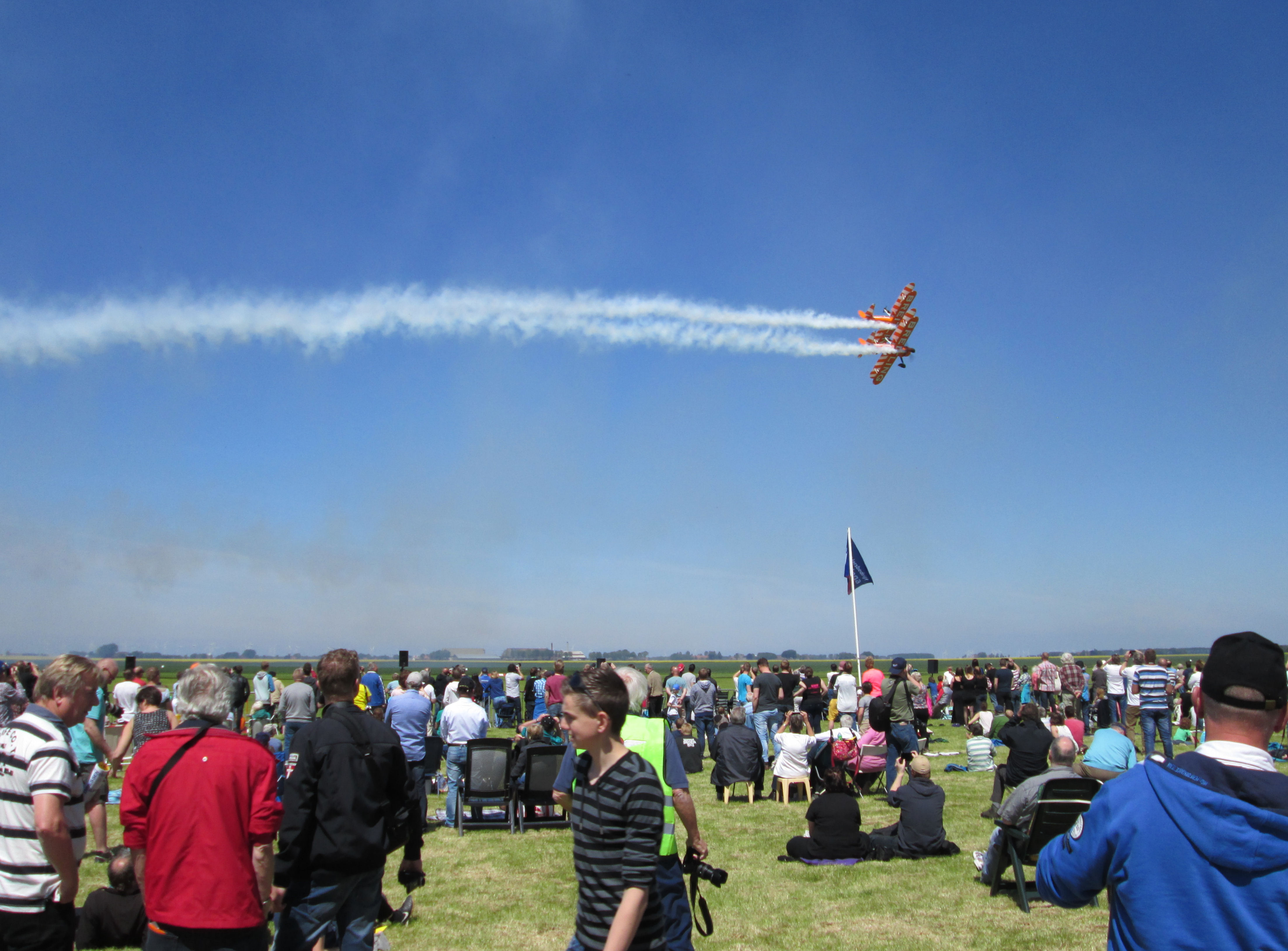 Op zondag toch geen kater! Eerst een vlucht met de Calmato van de vliegschool en daarna een mid-air collision met een snelle jager van een Duitser, waarbij mijn geliefde Vitesse bij zijn 196ste vlucht verloren ging… De Duitser en ik konden er om lachen, leuk voor het publiek…