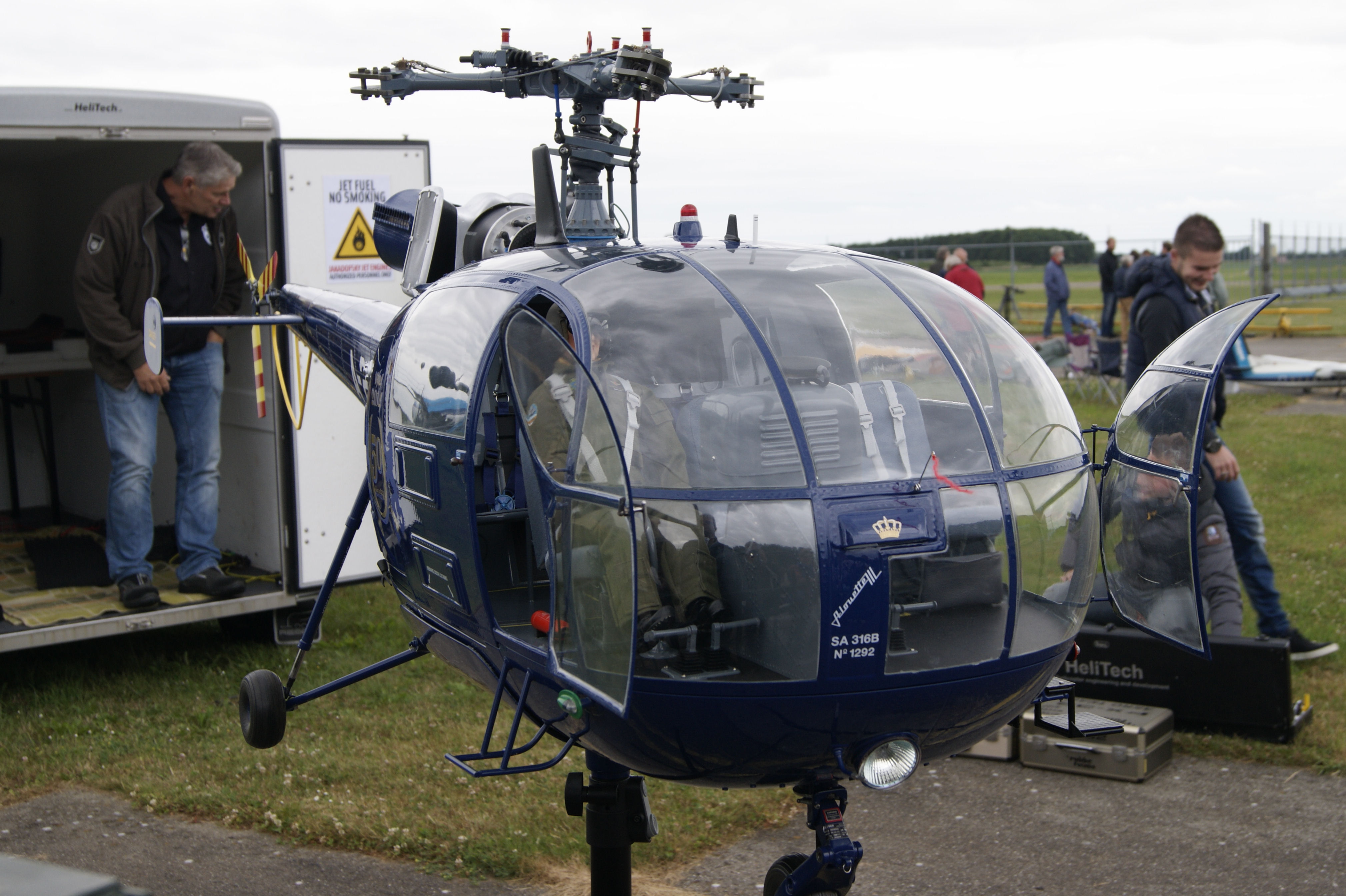 Fred Coenen (in de aanhanger op de linker foto) had zijn mooie schaal 1:5 Alouette III heli’s weer bij zich. De rood-wit-blauwe Grasshopper sloot de show af (archieffoto uit 2010).