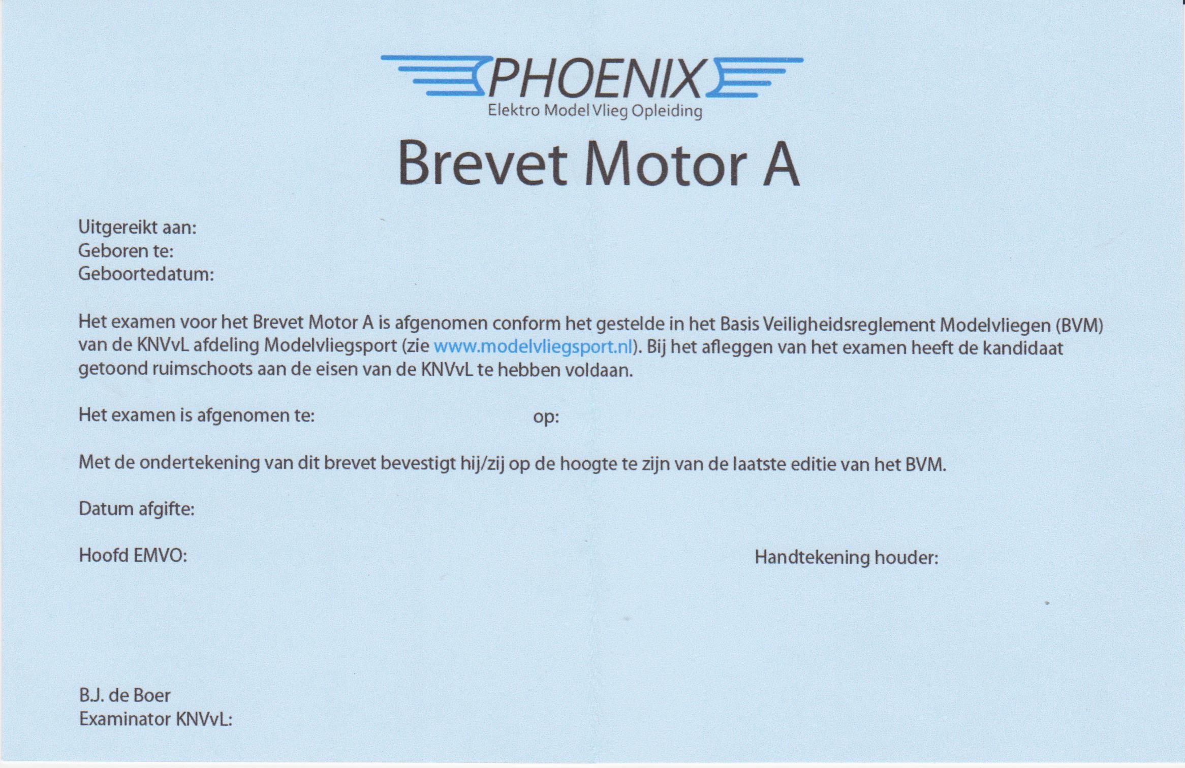 Het EMVO PHOENIX Brevet Modelvliegen A-Motor is een document van 20 x 13 cm (even groot als het oude KNVvL brevet). Dubbelgevouwen meet het 10 x 13 cm. Het kan worden behaald als je bij EMVO Phoenix met een echt model afvliegt en slaagt conform de eisen van de KNVvL. Die eisen zijn te vinden in het Basis Veiligheidsreglement Modelvliegen (BVM) op de website van de KNVvL. Dit brevet is tevens het clubbrevet van EMVC Romeo.