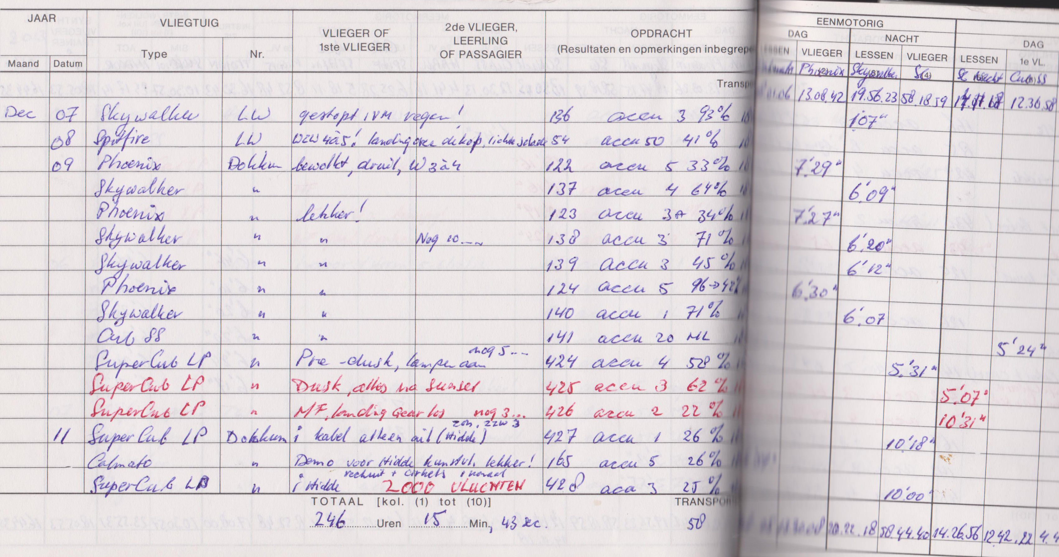 Er stond bijna geen wind (noordwest 1 á 2) en dus begon ik met mijn Sukhoi 26xp Ultra Micro van Parkzone. Dat ding heeft een spanwijdte van wel 40 centimeter (!) en ik heb hem eigenlijk gekocht voor het indoor vliegen. Maar dat had ik op dat moment nog nooit gedaan. Ik startte vanaf de tafel en dat ging heel goed. Daarna was mijn Horizon Super Cub LP aan de beurt, en die startte ik natuurlijk gewoon vanaf het gras. Na het droppen van een parachutist beoefende ik de low flight en de slow flight, ofwel de lage vlucht en het langzaam vliegen. Jawel serieus oefenen zit me in het bloed… De volgende vlucht was een mijlpaal: mijn 300ste modelvlucht en ik gunde deze weer aan de Super Cub. Deze vloog namelijk tegelijk ook voor de 150ste keer, een dubbele mijlpaal dus. Waarom ik dat zo exact weet? Ik ben namelijk zo gek om al mijn vluchten in een logboek bij te houden. Dat vind ik leuk en ben ik vanuit mijn vroegere werk gewend. Ik gebruik zelfs mijn originele logboek, waar ik ‘vroeger’ ook mijn KLu vluchten in schreef…