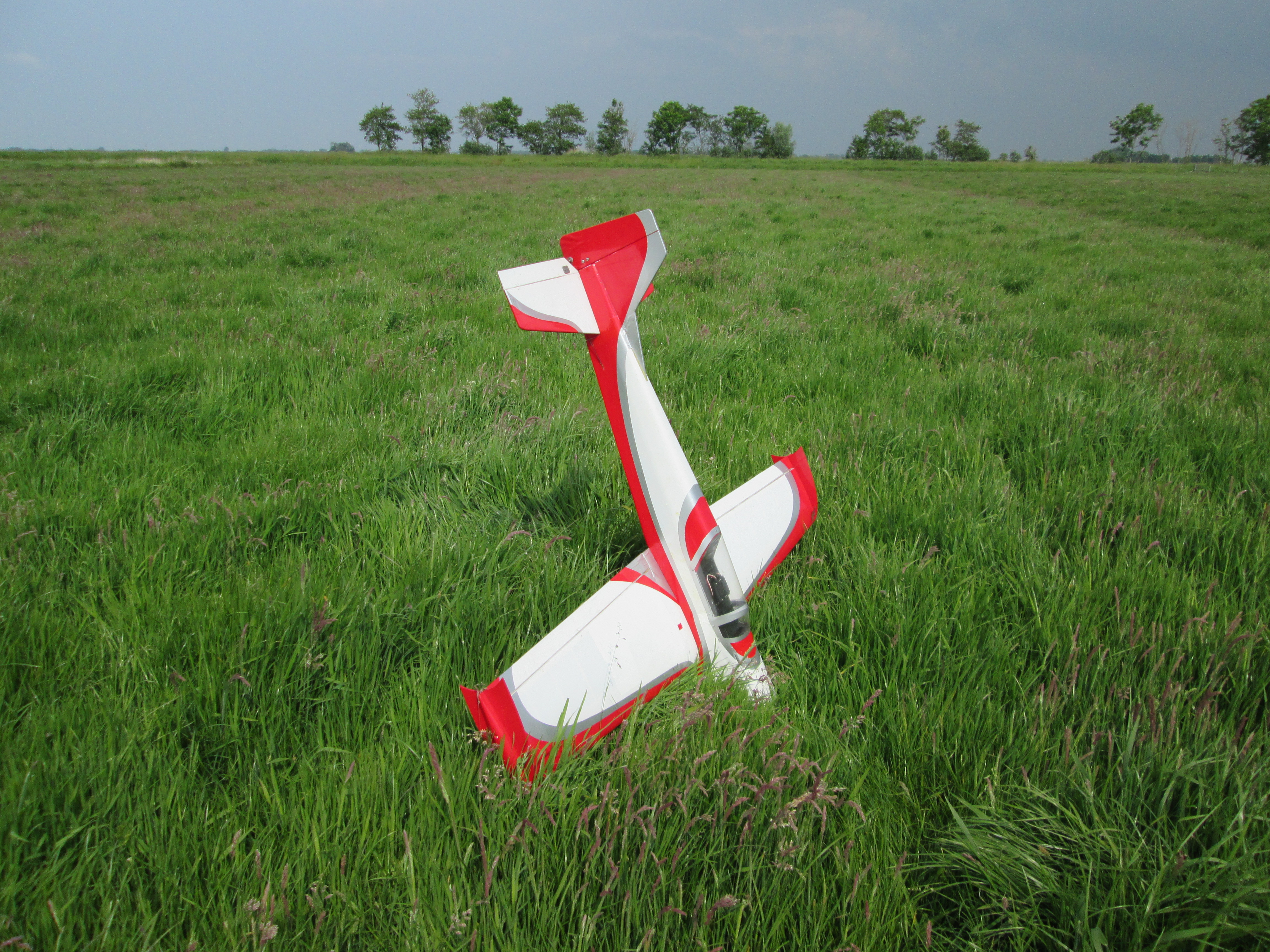 Ook juni begon goed, maar bij de vijftiende vlucht van de maand ging het een beetje mis… Het was op 3 juni op het veld van de verre club en ik kreeg mijn Phoenix niet uit een spin. Een ogenblik later stond hij met de neus in de grond als een kruis in de verte…