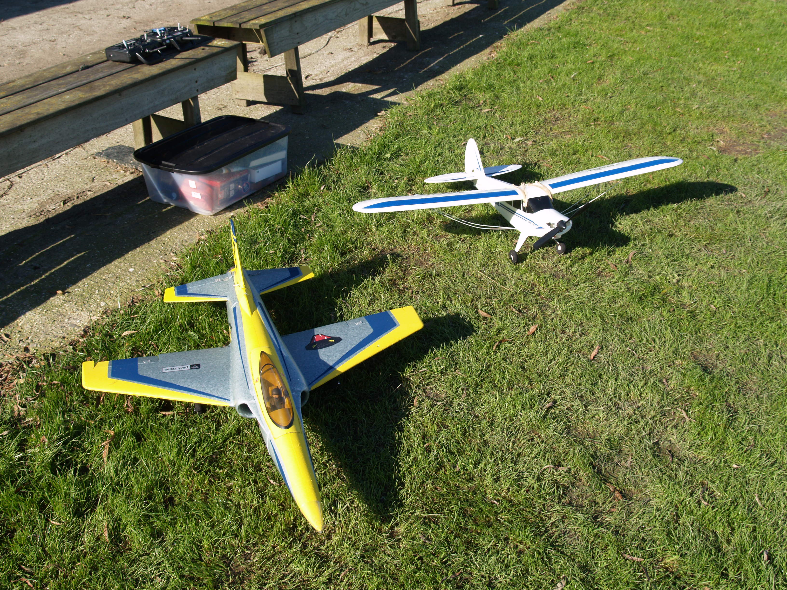 Na de eerste vluchten met de Super Cub onder leiding van Jaring, vloog deze ook mijn Habu in. Het grijs/geel/blauwe jetje ging mooi hard en was vooral heel wendbaar. Niet voor een beginner dus en daar zou ik in oktober wel achter komen… Na drie minuten hield Jaring het voor gezien en liet het felle en snelle monstertje een full stop maken. Hierna coachte Jack mij een tijdje. Zes vluchten met de Cub later al verklaarde hij me solo, zolang hij maar op het veld aanwezig was. Maar dat kan eigenlijk niet. Wie geen brevet heeft moet bij deze club altijd onder supervisie van een instructeur vliegen. Dat schijnt iets van doen te hebben met de dekking van de verzekering. Jack zou Jack niet zijn, als hij daar geen slimme oplossing voor had: hij coachte twee leerlingen tegelijk…