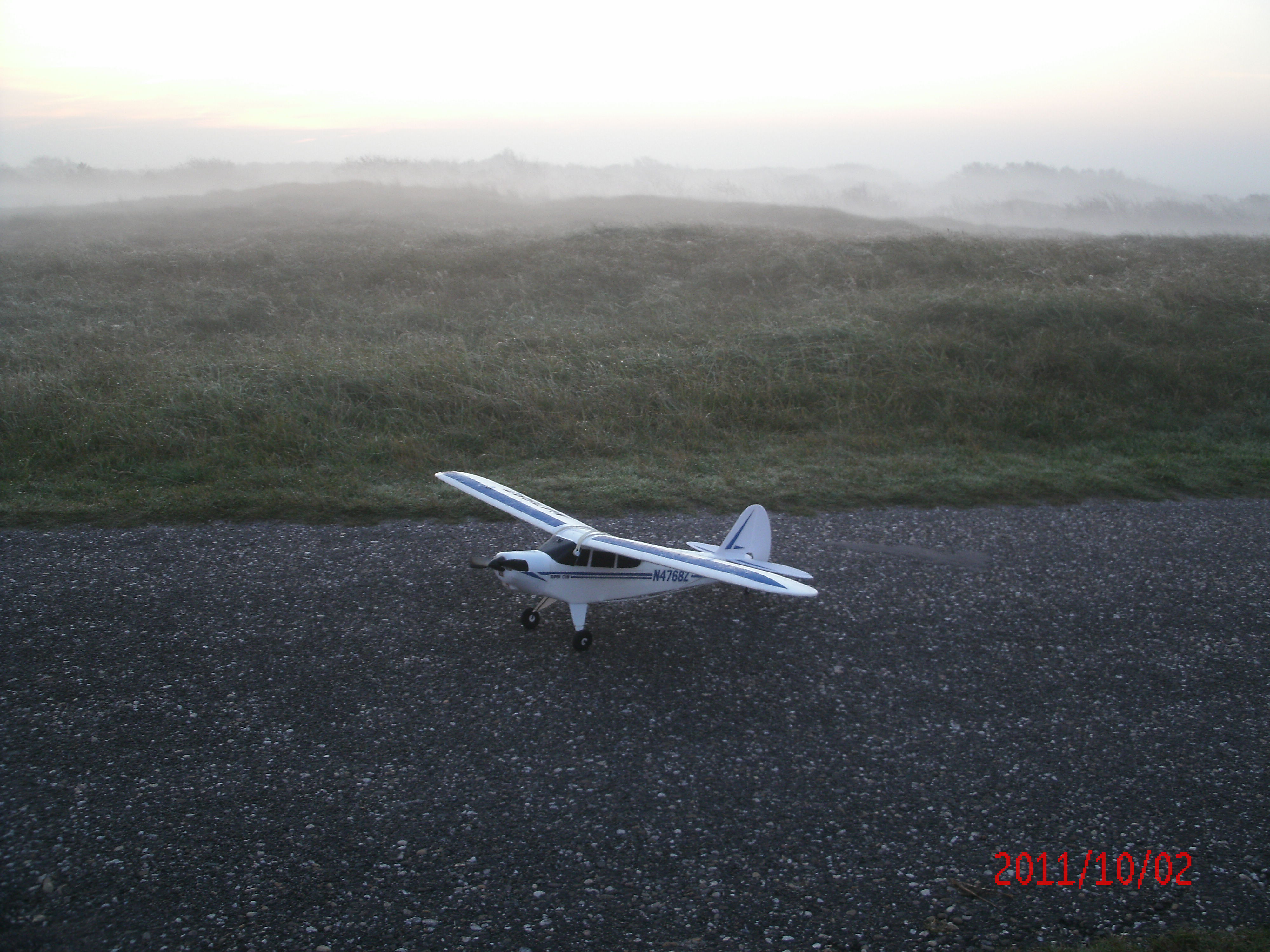 Zondagmorgen 2 oktober. Heti is even moeilijk op de fiets stappen, maar uiteindelijk ben ik in alle vroegte onderweg naar de duinen. Het is maar een kleine kilometer trappen en ik ben er zo. Dan maak ik eerst een paar foto’s van het toestel in de ochtendnevel. Even later kiest de Super Cub vanaf het nog verlaten fietspad de vrije ruimte. Alleen op de wereld sta ik heerlijk in de opkomende zon te sturen. Serieus oefenen, dat wel, maar tegelijk genieten dat het een aard heeft …