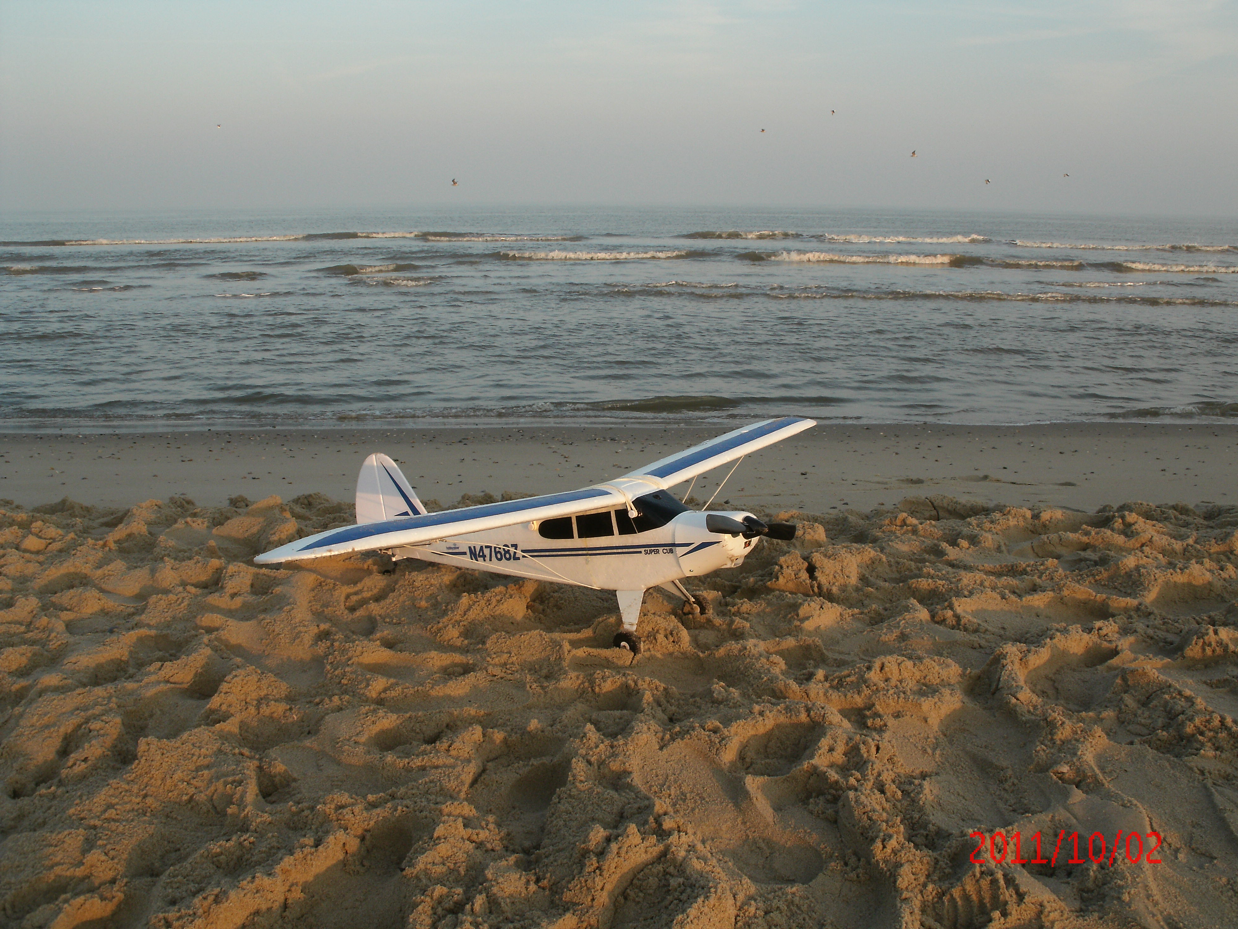 Op de fiets en weer alleen komen de overdenkingen van de modelvlieger. Zo, die had ik met zijn kater van de avond ervoor met mijn zacht zoemende Super Cub veel te vroeg gewekt! Wist ik veel … Bleek er precies onder mijn vliegcircuit een camping te liggen, die zelfs met moeite doen niet te zien was … Eigenlijk kan ik er achteraf de humor wel van inzien. Maar wat nu? Ik besluit richting de zee te rijden, daar is zeker geen al dan niet permanente bewoning die ik op dit vroege uur onbedoeld lastig kan vallen … Onderweg zie ik wel een paar geschikte plekken, maar dan moet ik telkens vanaf de weg starten. Stel je voor dat er opeens een auto aankomt, op een platgereden Cub zit ik ook weer niet te wachten. Zeker niet na zo even… Dan maar door naar het strand.