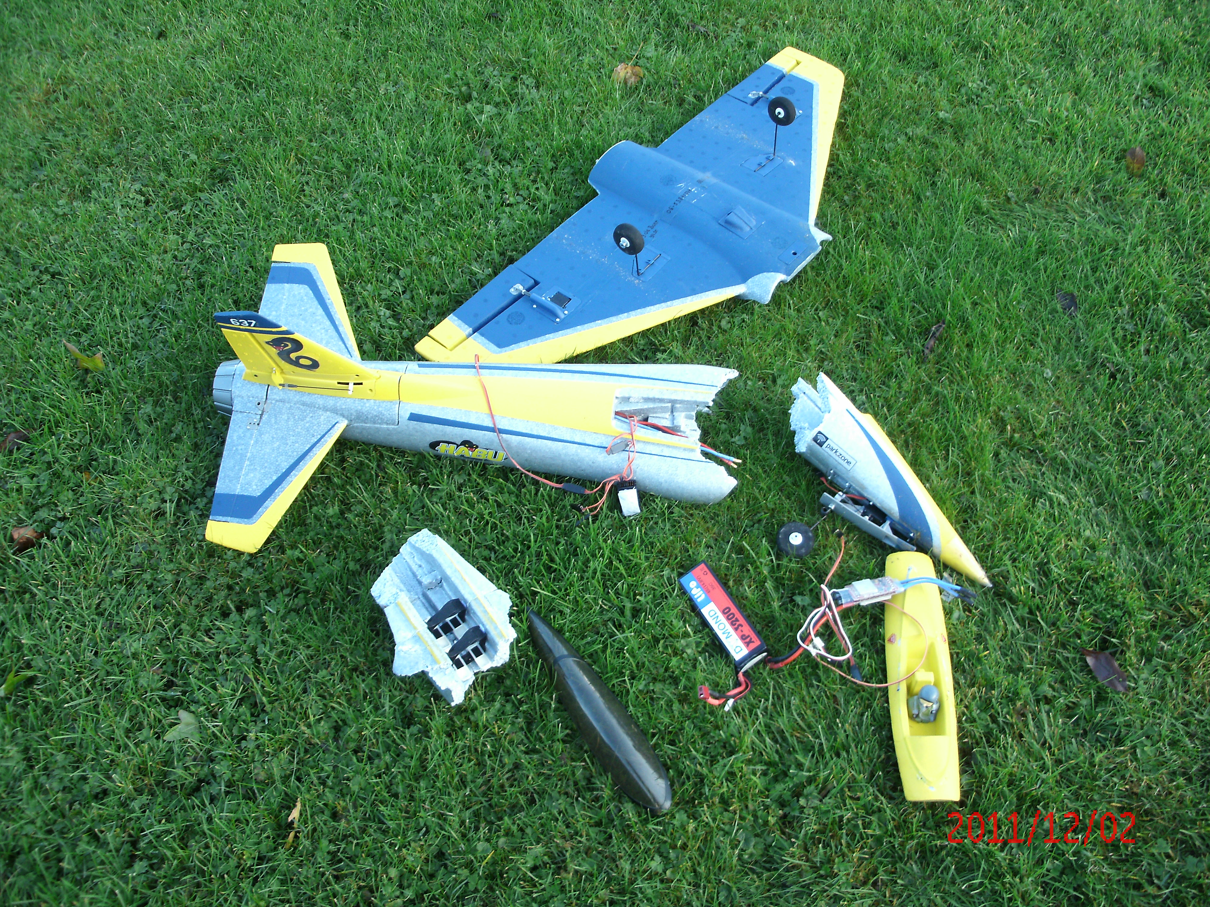 Terug op het vaste land ging ik de zaterdag er op weer naar de club. Het werd tijd dat mijn Habu jet weer eens aan de tand werd gevoeld en Jaring was de man om dat te doen. Hij had als enige alle eerdere vluchten met de Habu gemaakt. Erik keek toe. Na de control-check taxiede ik het jetje zelf naar de startplaats. Daarna gaf ik de zender aan Jaring. Hij gaf vol gas en jankend koos het blauwgele monstertje het luchtruim. Het was niet van lange duur. Het al in deel 3 beschreven overslaande geluid was weer goed te horen. De motor liep hortend en stotend. Al snel riep Jaring dat hij het toestel ‘niet kon houden’. In kleine vreemde cirkels ‘dreef’ de Habu met de best wel harde bovenwind mee en toen sloeg het een paar honderd meter verderop te pletter in het weiland. Jaring zette beduusd de zender uit en Ik zette de stopwatch stil. De vlucht had 49 seconden geduurd…