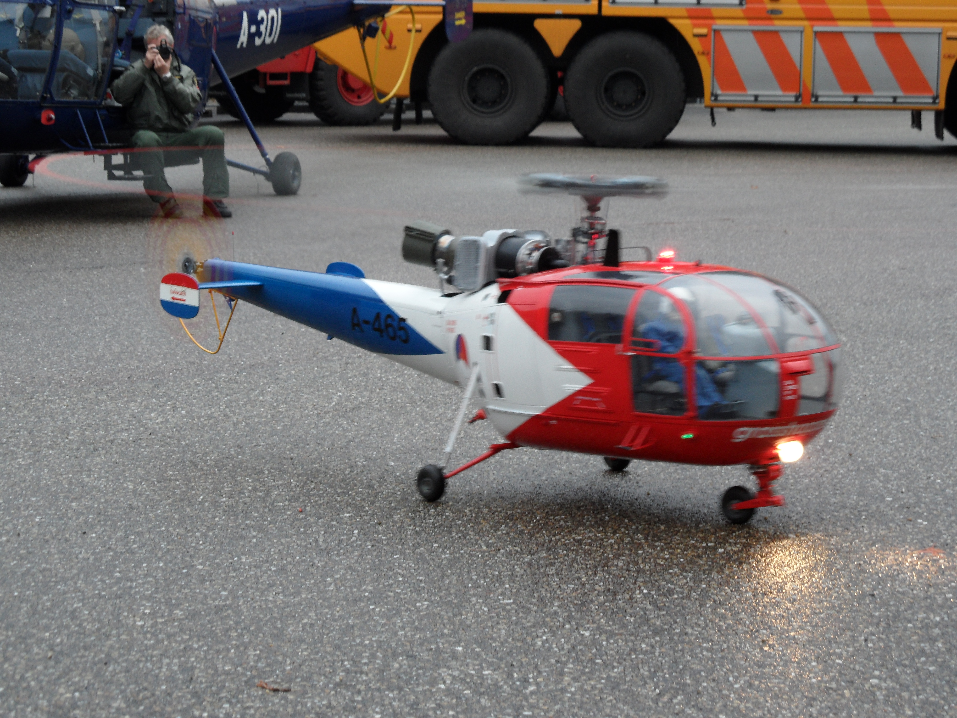 Op 28 oktober van hetzelfde 2010 was hij met zijn Gonnie bij een reünie van Omnia Cernens, de vereniging van oud-leden van de Groep Lichte Vliegtuigen van de Koninklijke Luchtmacht. Die werd gehouden in een hangaar op de voormalige vliegbasis Deelen. Voor hem bekend terrein, want hij had daar van 1975 tot de sluiting eind 1995 gewerkt. Hij genoot van die dag, samen met zijn vrouw en een aantal oude maten, die hij alweer veel te lang niet had gezien. Iedereen werd gevraagd naar buiten te gaan voor een demonstratievlucht van een Alouette III helikopter van de Grasshoppers, het demoteam van destijds. Het verzoek werd vergezeld van een opstartende Artouste IIIb turbinemotor. Nog binnen in de hangaar… Het bleek om een heel mooi radiografisch schaalmodel van de A-465 te gaan, een kist waarop hij veel vluchten had gemaakt. Schaal 1 op 5, dus met een rotordiameter van ongeveer twee meter. Uitgerust met een echte straalmotor… Met draaiende motor, maar nog stilstaande rotor, werd de heli uit de hangaar getrokken. Buiten werd de rotor gekoppeld en toen het toestel in de hover kwam, hing het met het rechter wiel iets naar beneden. Precies zoals zijn grote bemande broer! Zijn hart ging open. Een onvergetelijke vliegshow volgde, die zelfs eindigde met een heuse autorotatie…