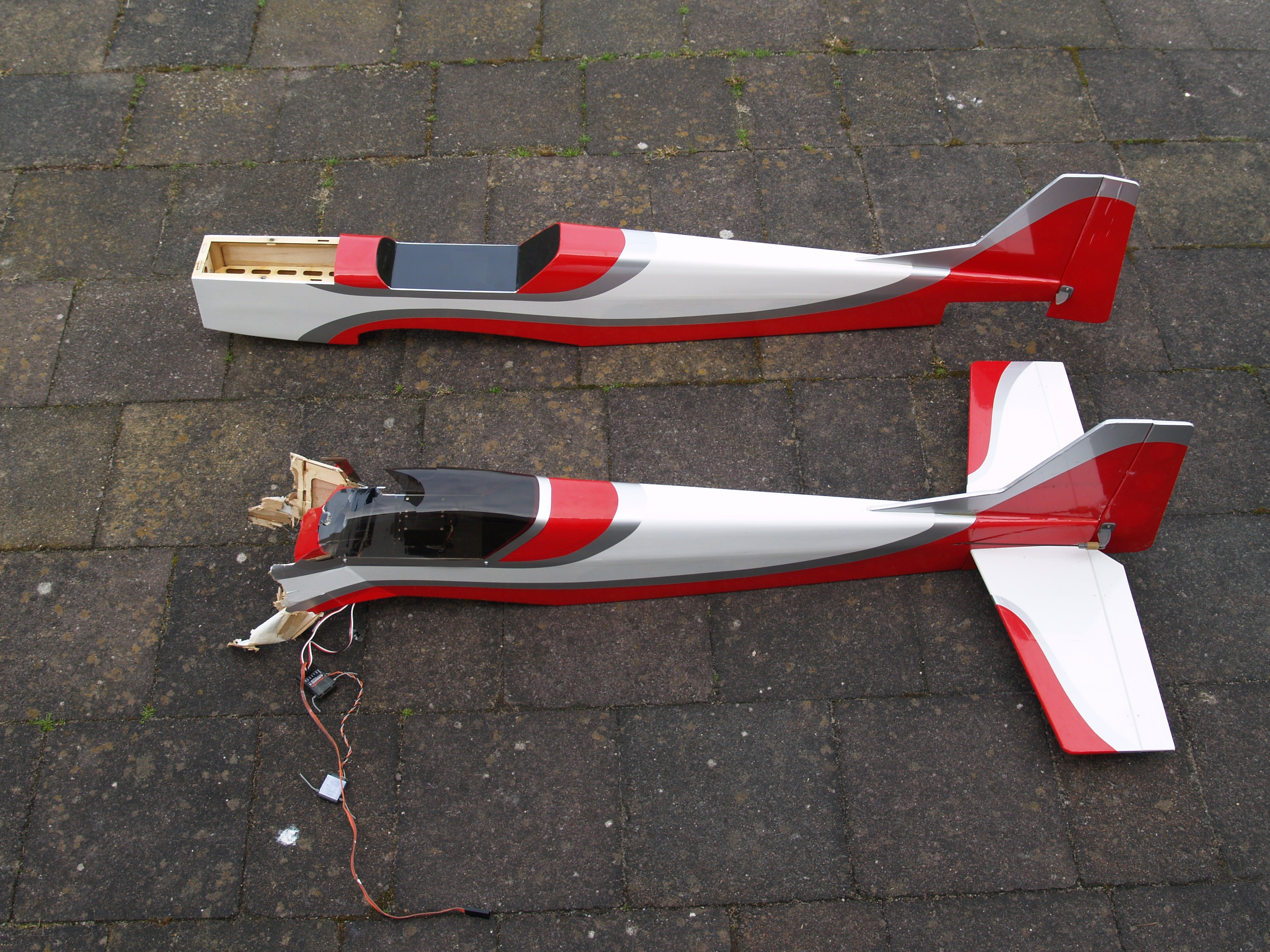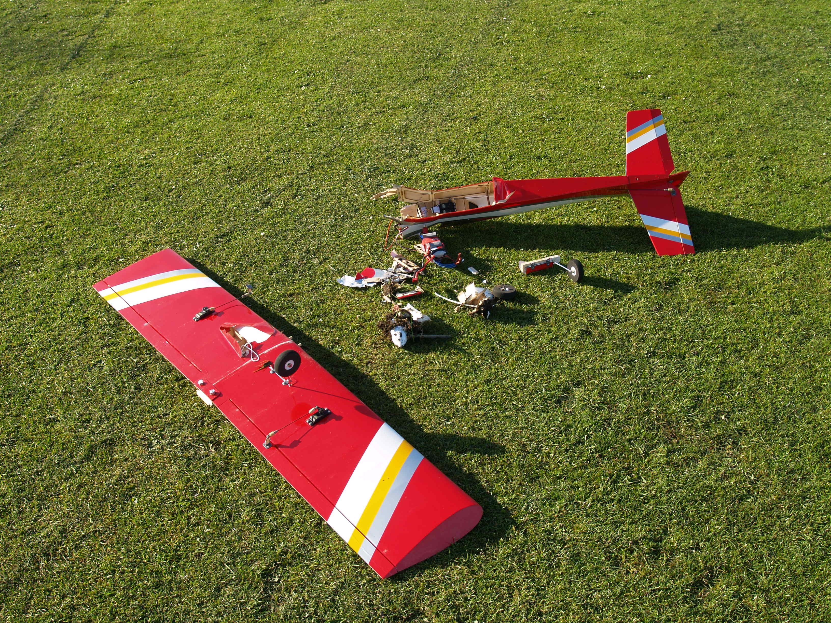 Die maand ging ik ook nog een keer naar Wil om een dagje te vliegen in Garreweer. Ik maakte vijf vluchten, waarvan er een wel heel komisch eindigde. Mijn Habu had mooi gevlogen en ik maakte mij op voor de landing. Op final dacht ik dat er een grote donkere vogel met mijn kist in botsing kwam. Maar het bleek het vliegtuig zelf te zijn: de gehele vleugel had afscheid genomen van de romp! En dat terwijl ik vooraf nog de bevestiging had gecontroleerd… Thuis bedacht ik een failsafe oplossing: tape over de schroeven…