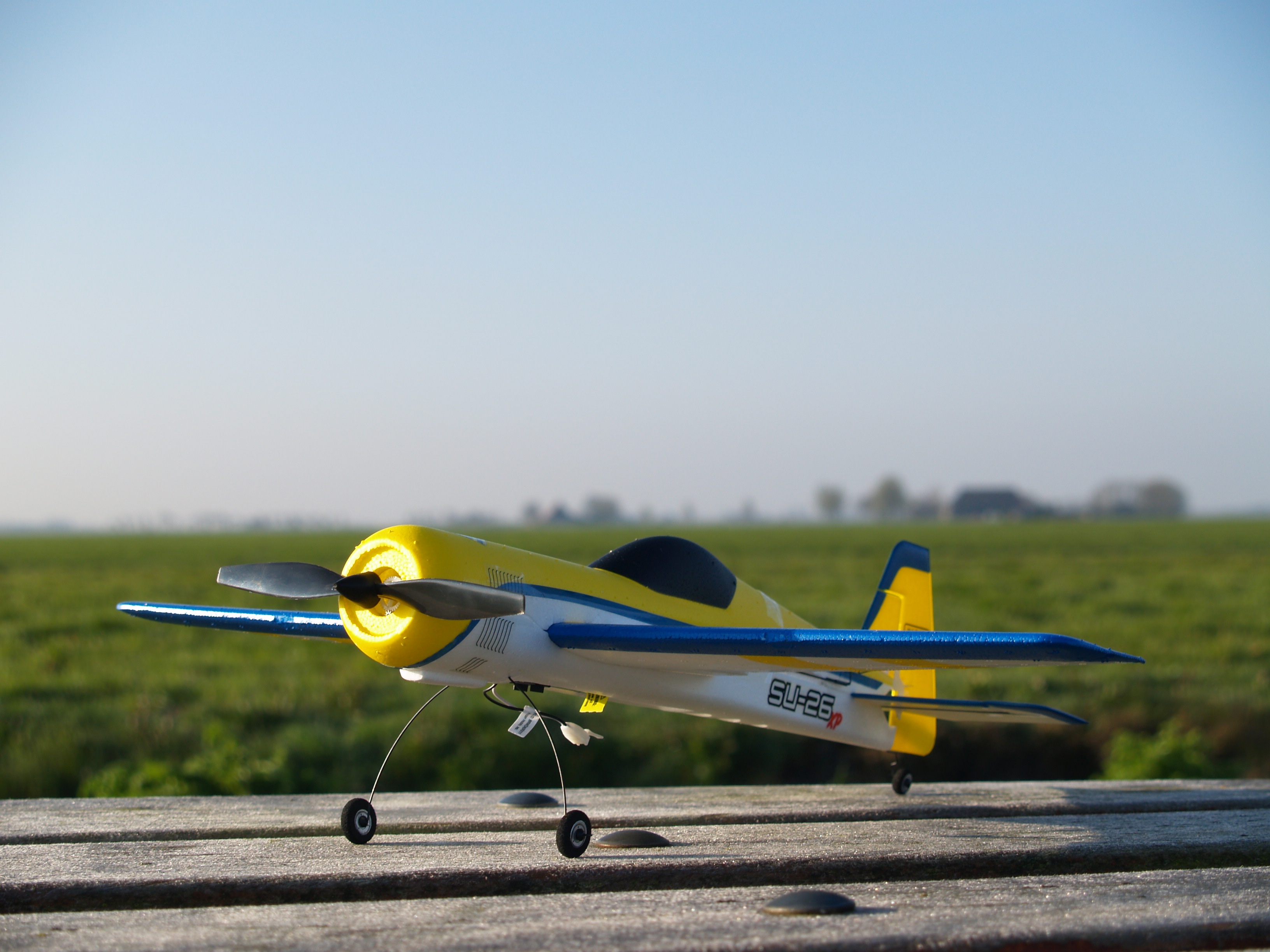 Al de volgende dag ging ik meteen weer ‘de wei in’, door voor het eerst zelfstandig met mijn Habu te vliegen. Spannend, maar het ging goed. Ondertussen had ik in Dortmund op de beurs voor 50 euro een Ultra Micro Sukhoi SU-26XP (spanwijdte 40 cm!) op de kop getikt, een koopje!