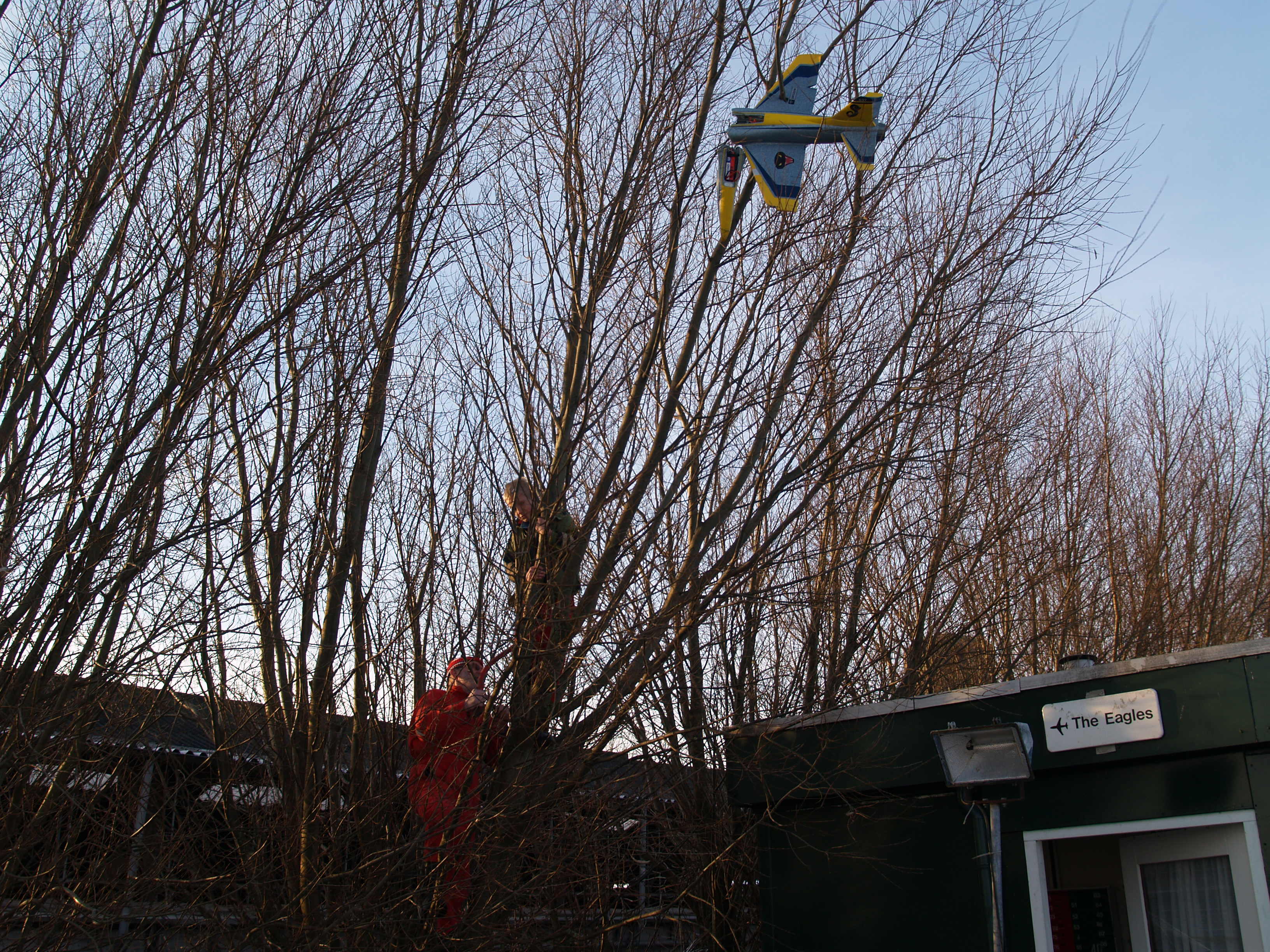 Ondertussen verliep de laatste ‘vlucht’ van de Habu van dat jaar ook niet al te goed. Maar wel met veel hilariteit! Het was 8 december. Ik had de wielen van de Habu af, omdat hij in het natte gras toch niet los kwam. Er lagen namelijk al sinds september plassen op de velden van mijn beide clubs, wat me ertoe bracht ook in lid te gaan worden bij een club met een verharde baan op een echt vliegveld. Afijn, lid Cor zou de Habu voor mij lanceren. Maar hij gooide niet hard genoeg. Het toestel overtrok, ik drukte de neus en leek hem onder controle te krijgen. Toen ‘stak er een boom over’… De Habu hing precies op het zwaartepunt in de takken, zodat hij telkens daaromheen rond draaide. We moesten uiteindelijk de halve boom omzagen om hem vrij te krijgen. Alle aanwezigen, en dat waren er nogal wat, hadden me toch een lol… Het aantal crashes met dit ding stond al op zeven of acht, ik ben de tel onderhand wel kwijt…