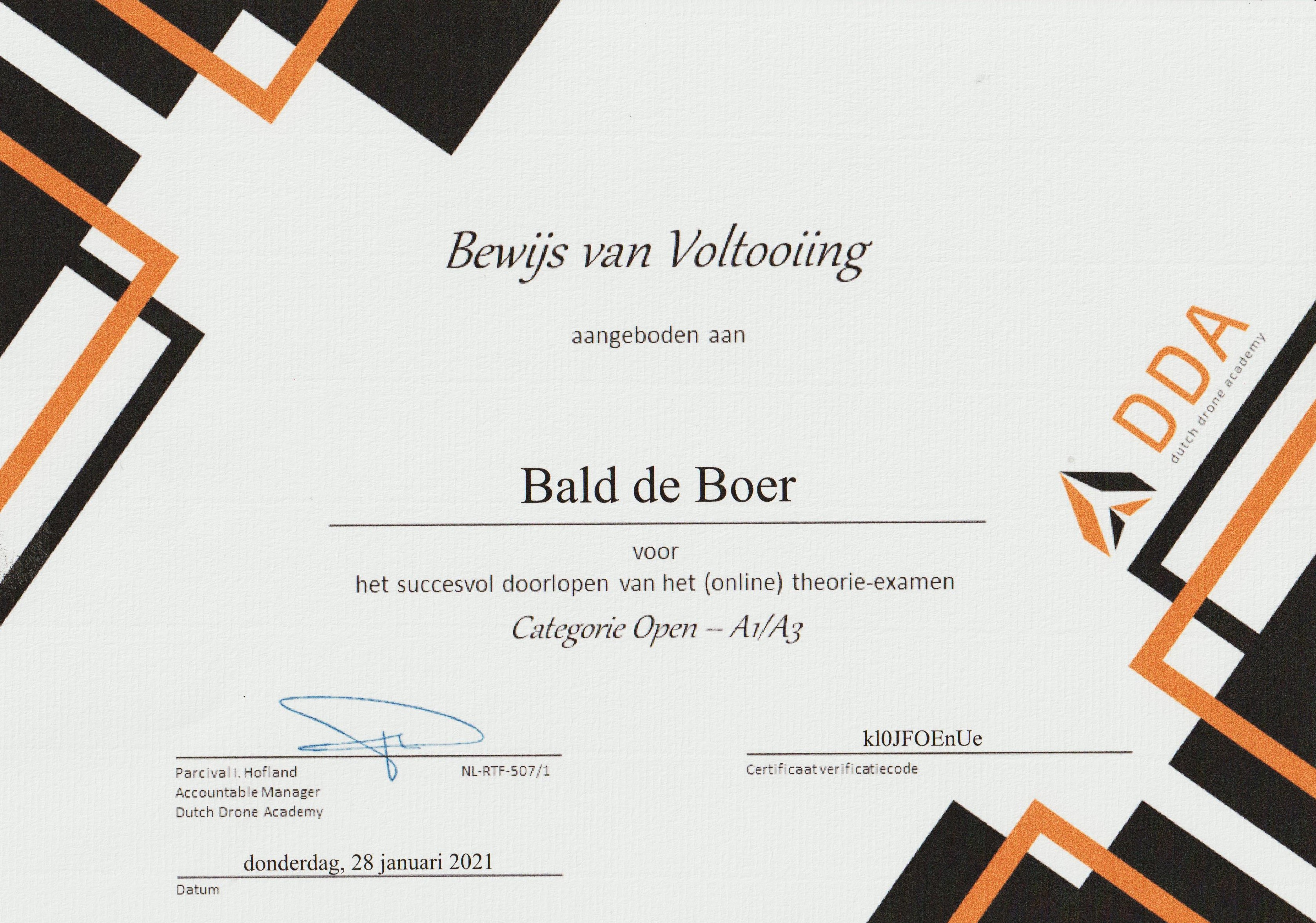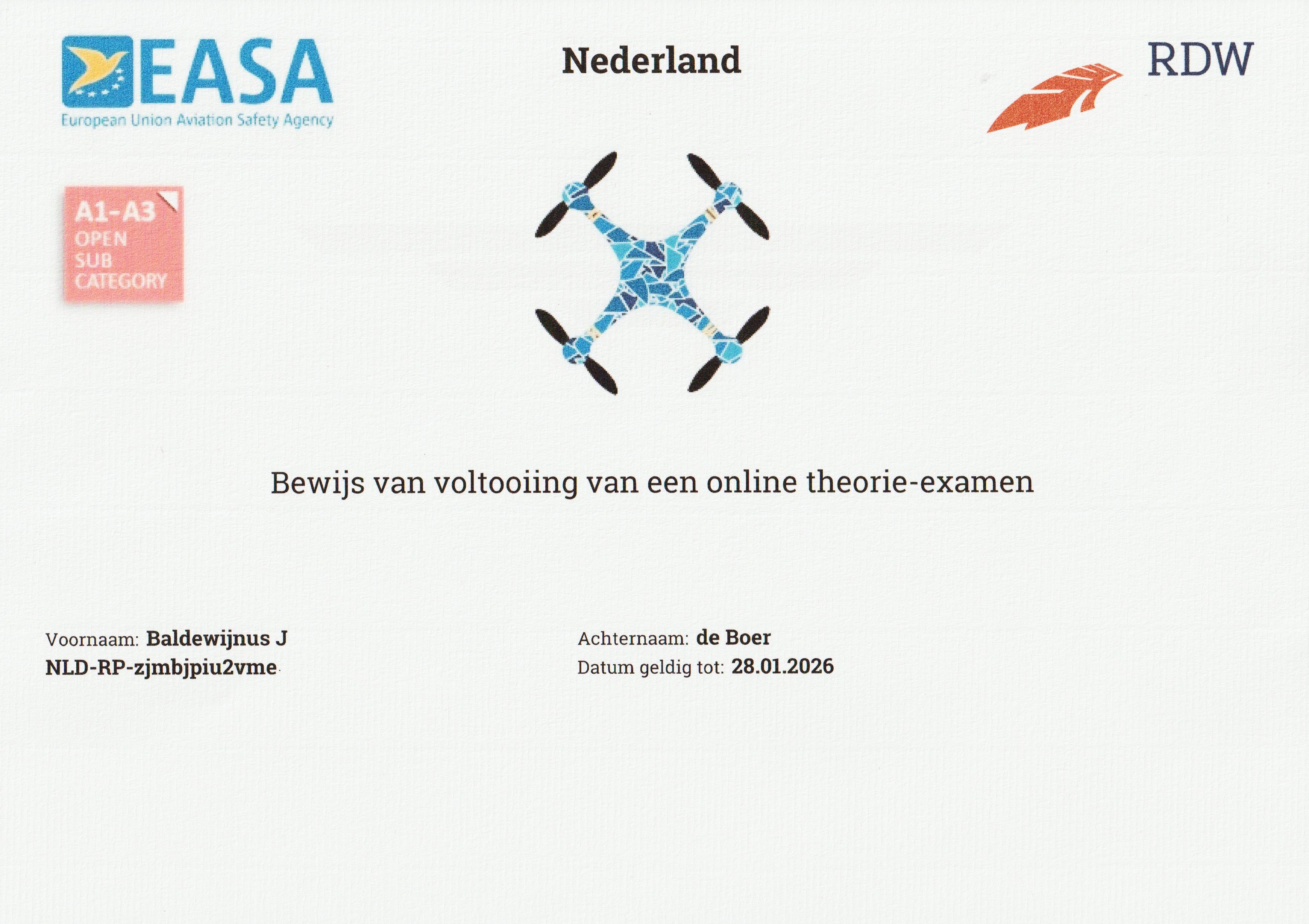 Wil je buiten clubverband vliegen, het oude ‘wildvliegen’, dan dien je met drones vanaf 250 gram of een camera, een certificaat bij je te hebben (of op je telefoon). Op dat certificaat staat dat je de cursus “A1/A3 Open Categorie” hebt voltooid. Ook dit certificaat wordt afgegeven door de RDW. Maar pas nadat je de opleiding A1/A3 met goed gevolg hebt afgerond bij een door het Rijk erkende instelling. Bijvoorbeeld de Dutch Drone Academy (DDA). Dat kost geld. Bij de DDA was de opleiding (in januari 2021) 59,90. Het registreren bij de RDW van het bewijs van voltooiing (afgegeven door de opleiding) kost nog eens 10 euro. Daarna ontvang je het certificaat van de RDW.